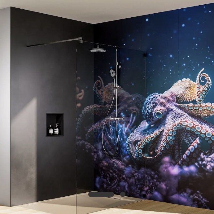 Teilrenovierung mit Duschrückwände aus Alu-Dibond Platten. Fugenlos einfach zu reinigen.